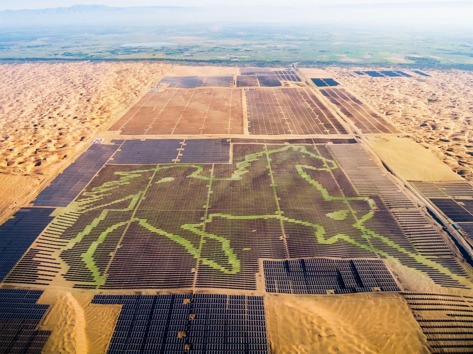 整齊排列的光伏發電板下,長出的叢叢綠意令人欣喜。光伏項目穩固了土壤,當地人得以安居樂業,也顯著改善了首都北京的風沙氣候。