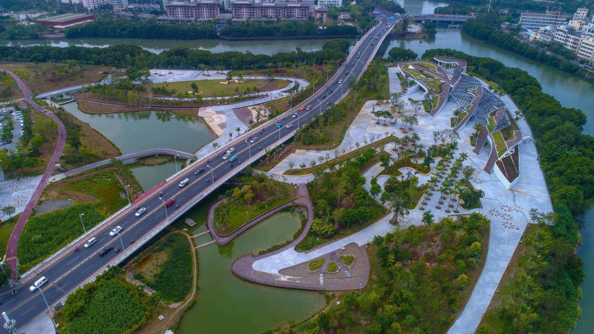 為保證公園靜謐,在豐興隆大橋兩側,特意設置兩處緩坡地形,土丘上種植密集的植被,對橋上交通進行遮擋,減少噪音與車流對公園的影響。